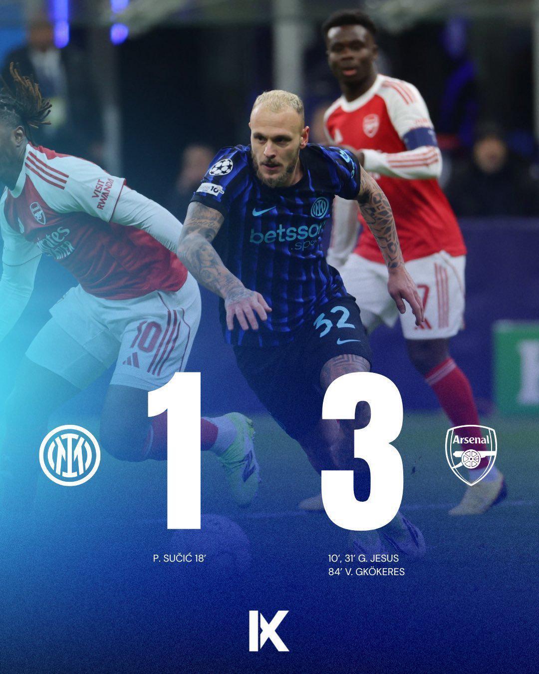今天凌晨,国米在欧冠联赛阶段第7轮比赛中主场迎战阿森纳,虽然苏契奇在第18分钟打进一脚漂亮的世界波进球,但依然难挽球队整体败局,阿森纳热苏斯梅开二度、约克雷斯替补出战同样打进世界波,最终国米主场1:3输掉比赛。而这是继不敌马竞、利物浦后,国米队史首次遭遇单赛季欧冠三连败!